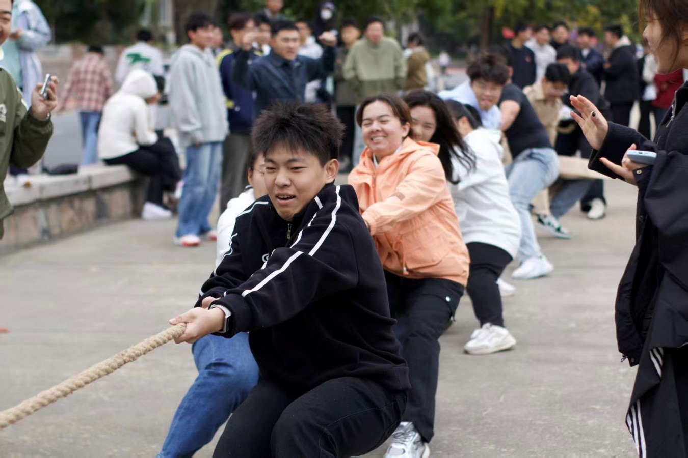 为响应“爱体育,兴科大”校园体育文化号召,丰富校园文化生活,展现班集体卓越风采,增强班级凝聚力,化学院于2025年10月19日在小五四广场组织2025级学生开展了一场热血沸腾的拔河比赛。本次比赛以班级为单位进行角逐,14支队伍踊跃参赛,每支队伍由5名男生和4名女生组成,通过抽签分组确定比赛顺序。