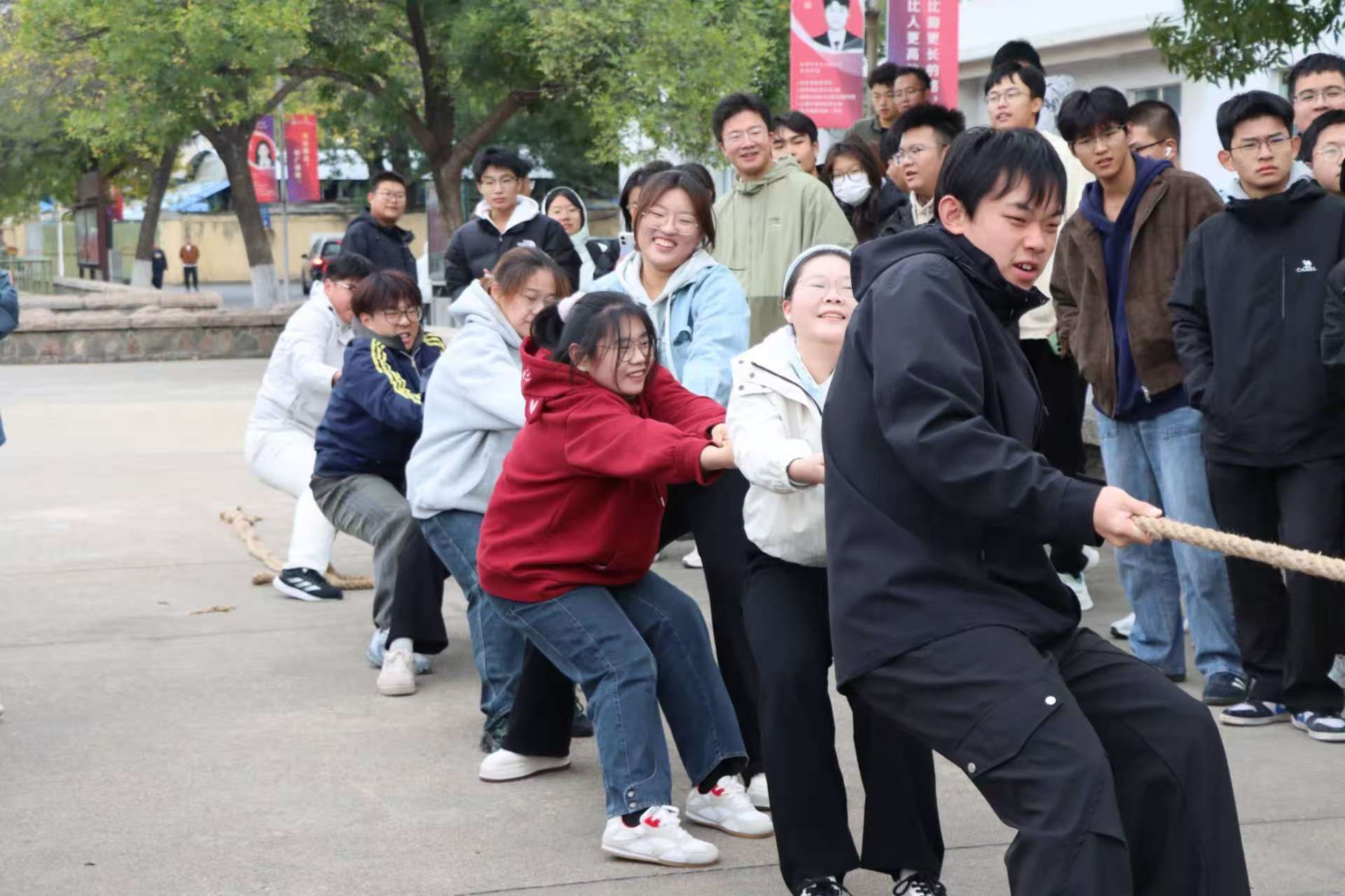 比赛现场氛围热烈如火,各队选手摩拳擦掌、斗志昂扬。随着裁判一声清脆哨响,比赛正式开始。双方队员瞬间发力,身体奋力后倾,拼尽全力向己方拉扯绳索,每一局都堪称惊心动魄的较量,也拉近了同学们之间的距离。