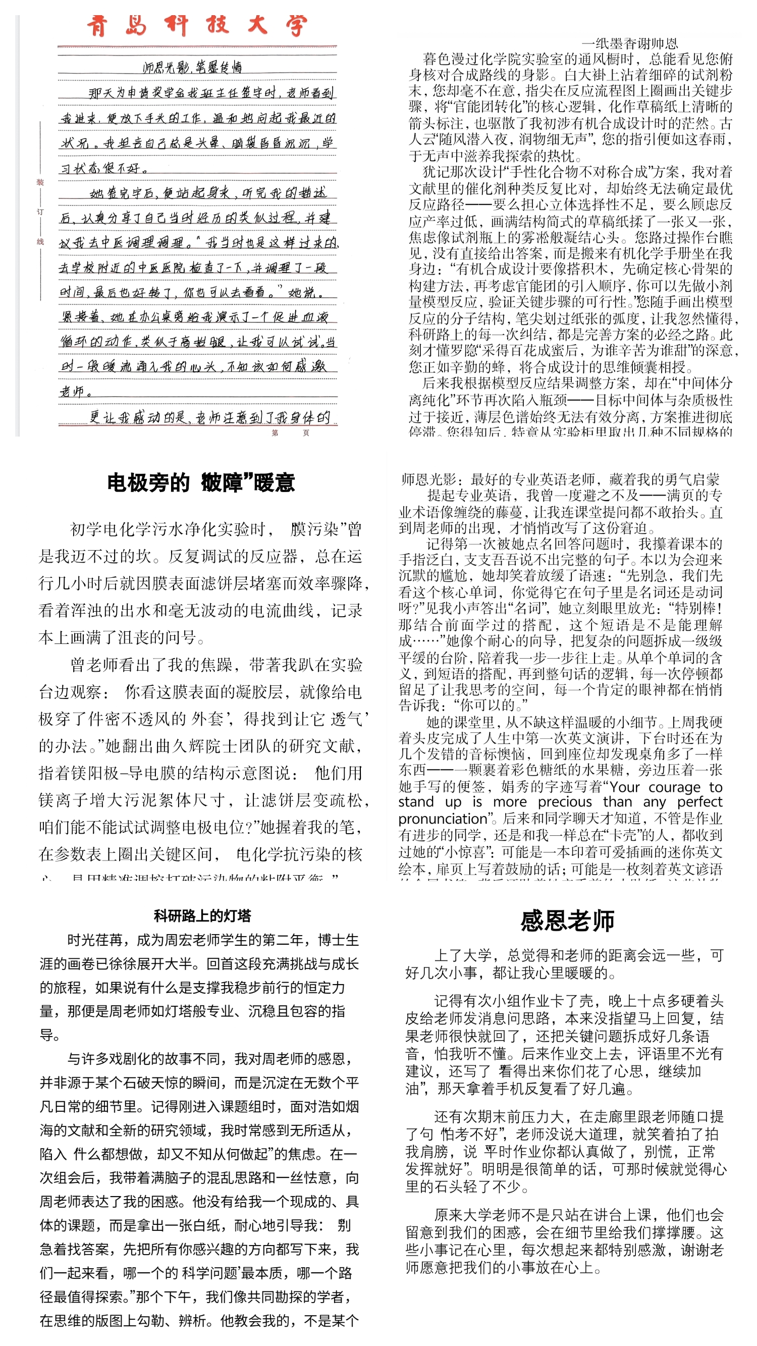 文字是传递情感的信使,“温情短文”活动中,同学们将对老师的感恩与眷恋,都写进了字里行间。老师们不仅在学术上倾囊相授,更在人生道路上为学生拨开迷雾,他们的关怀如春风化雨,润物无声,深刻影响着学子们的成长轨迹与人格塑造。温情的短文,是对老师日常笔墨批注的回应,笔墨往来之间,藏在文字里的师生情有了双向奔赴的温度。