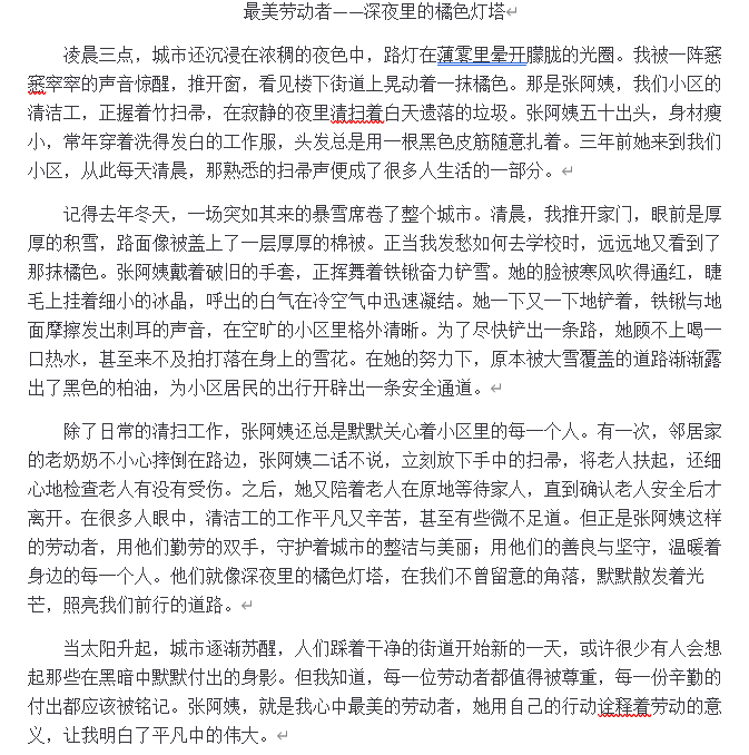 活动中,魏佳慧同学的征文《最美劳动者——深夜里的橘色灯塔》引发广泛共鸣。她以细腻笔触描绘保洁阿姨清晨劳作、图书馆员耐心整理的身影,将平凡岗位上的坚守刻画得温情而有力。文章写道:“劳动精神就蕴藏在这些恪尽职守的日常里。”其真挚的感悟深深打动读者,有效激发同学们对劳动价值与青春担当的深入思考。
